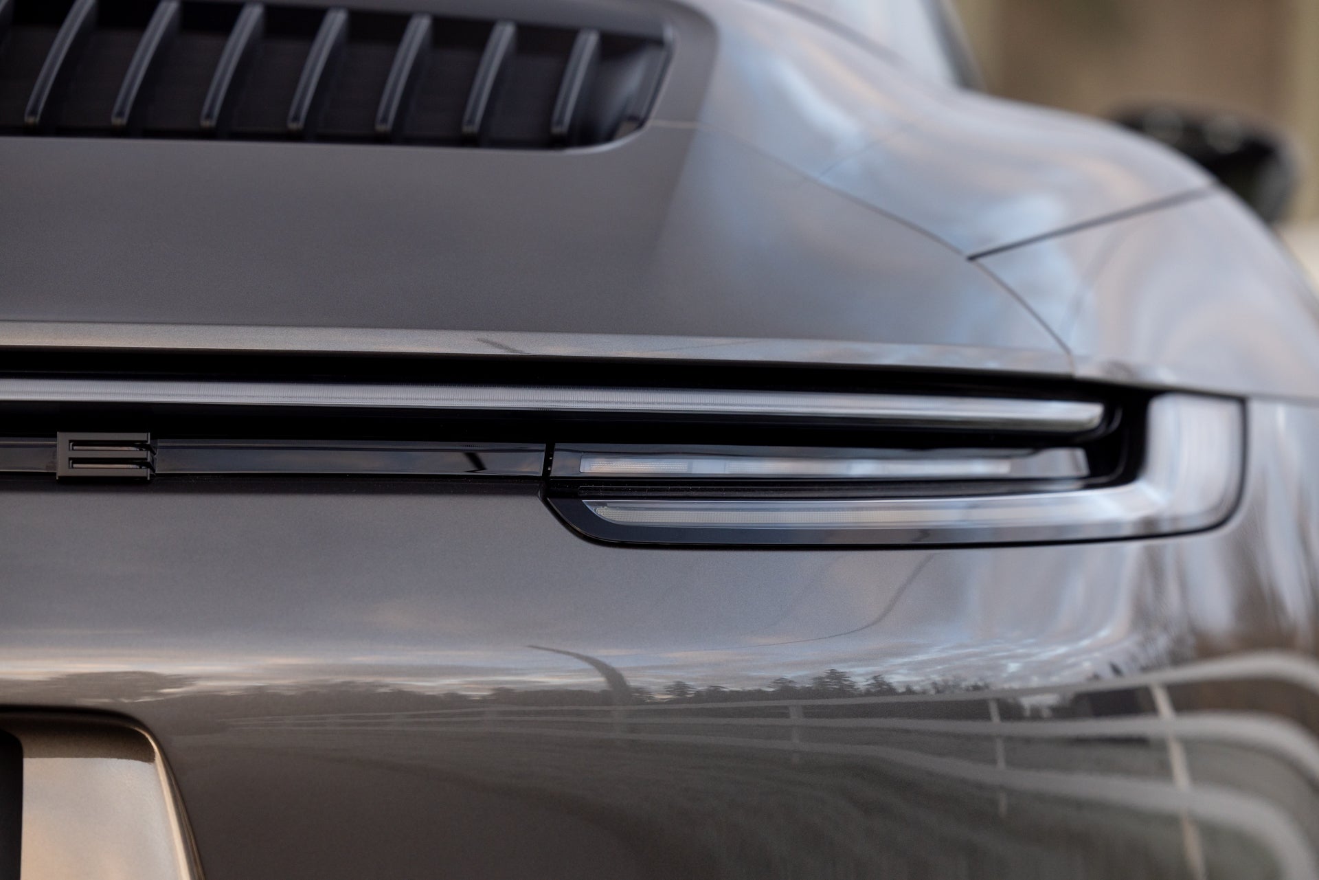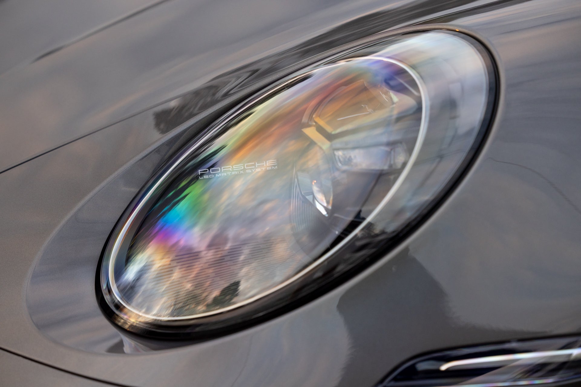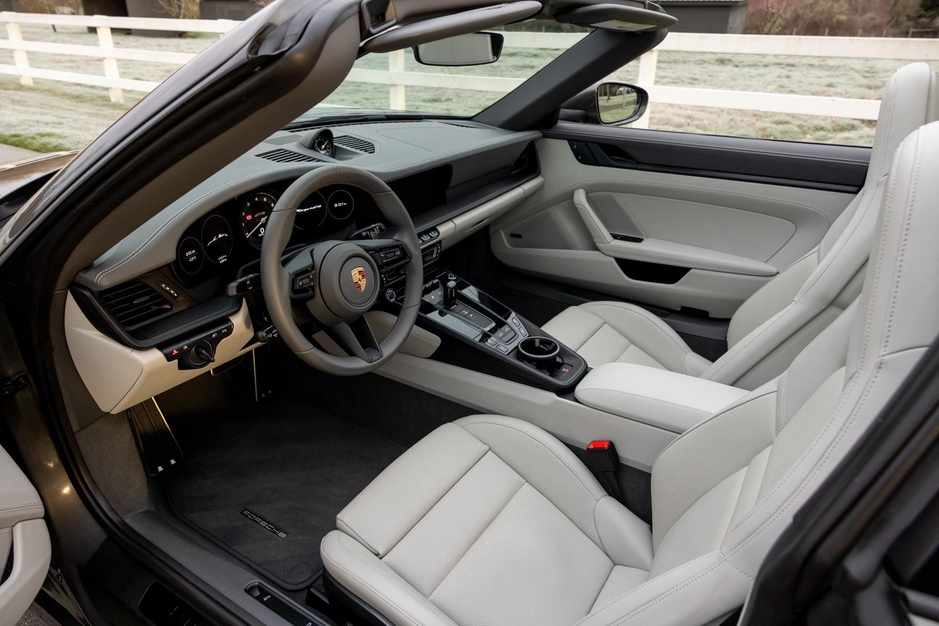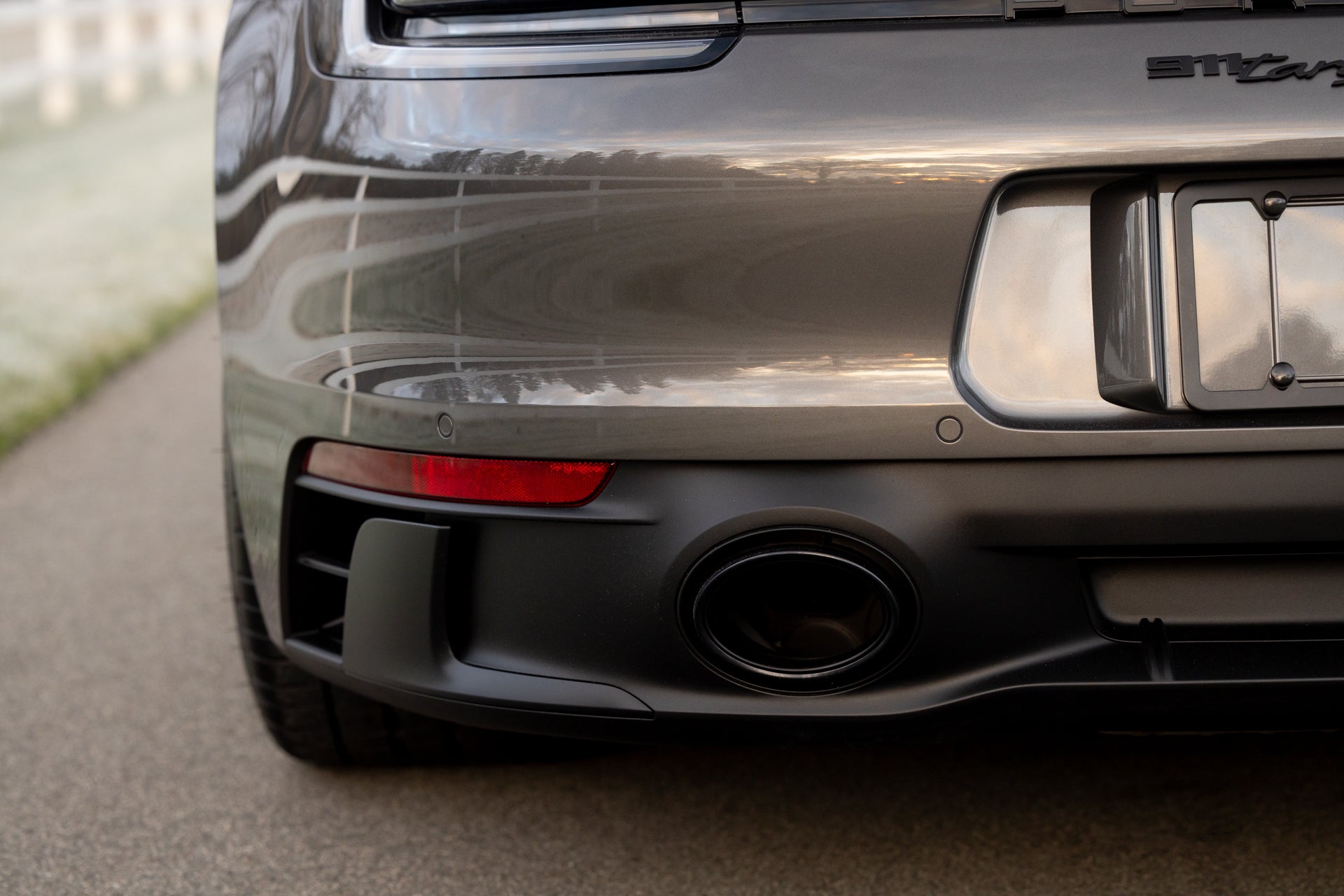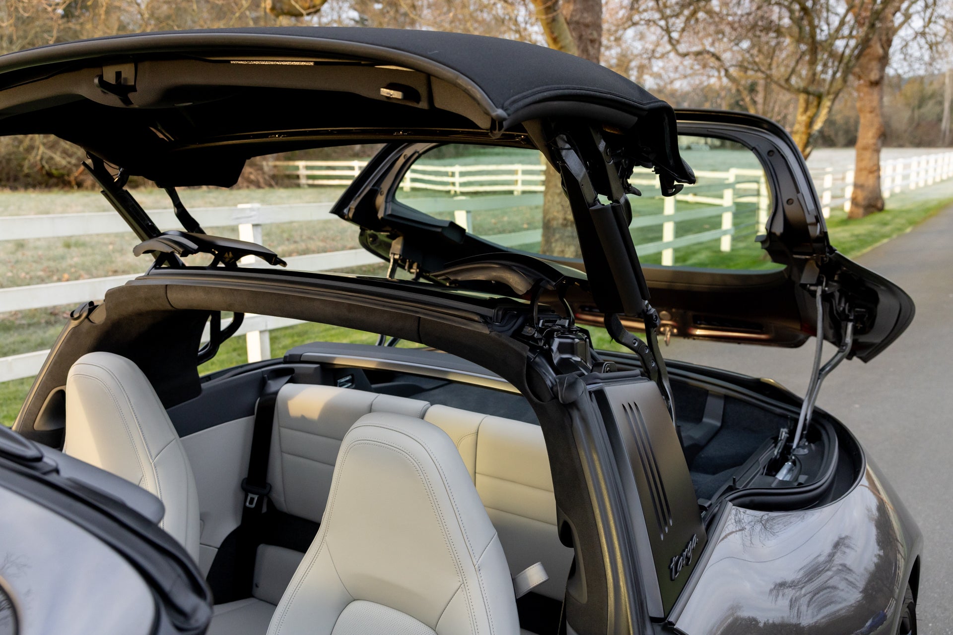 The exterior specification includes LED-Matrix Design Headlights in black with Porsche Dynamic Light System Plus, providing adaptive illumination that adjusts beam patterns based on traffic and road conditions. Exclusive Design Taillights distinguish the rear lighting signature from standard 911 variants. Under-door puddle light projectors illuminate the entry area when approaching the vehicle, and the black fabric Targa roof contrasts with the Agate Grey Metallic bodywork. Front axle lift addresses ground clearance for driveways and steep approaches, while rear-axle steering improves low-speed maneuverability and high-speed stability through the variable steering geometry.