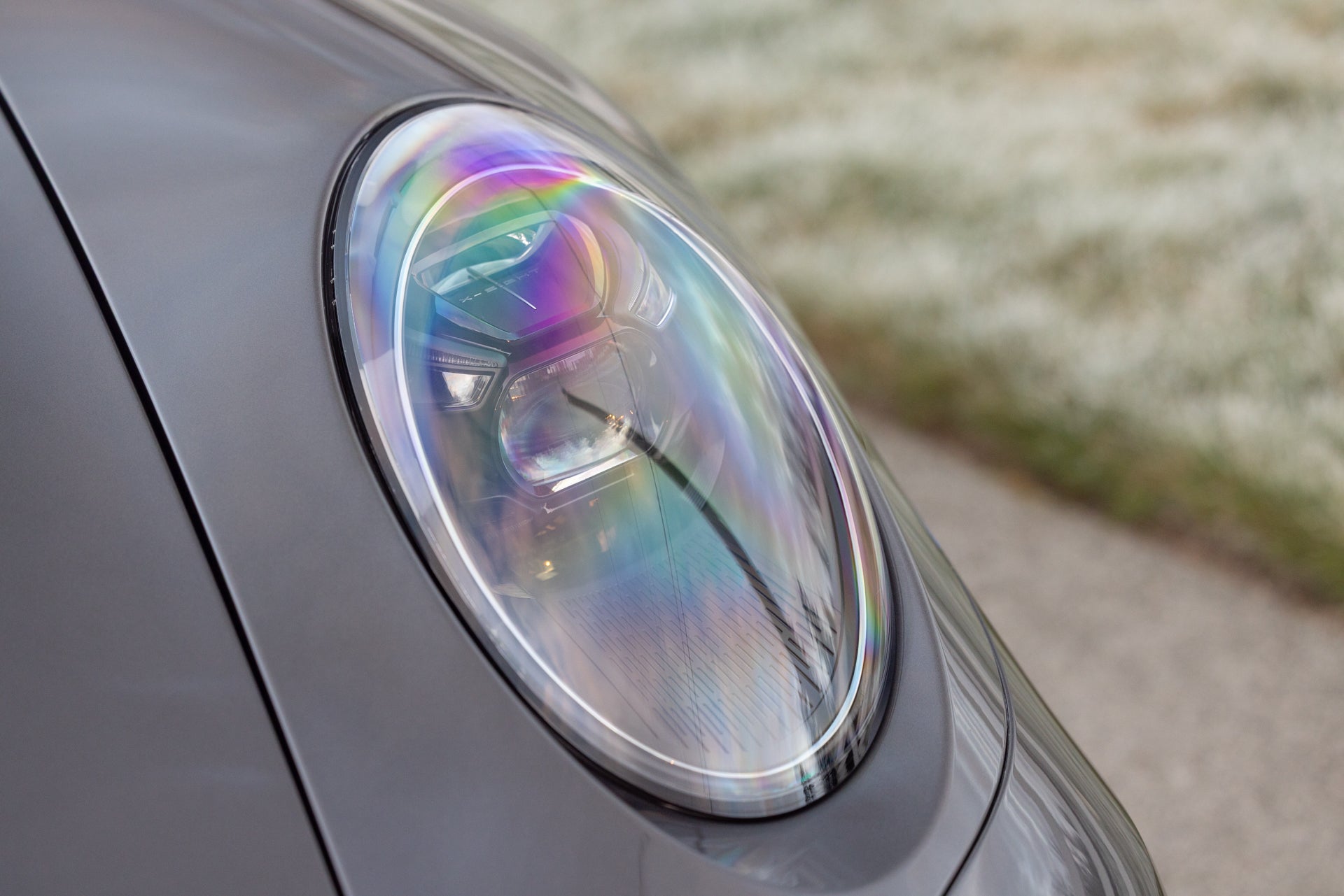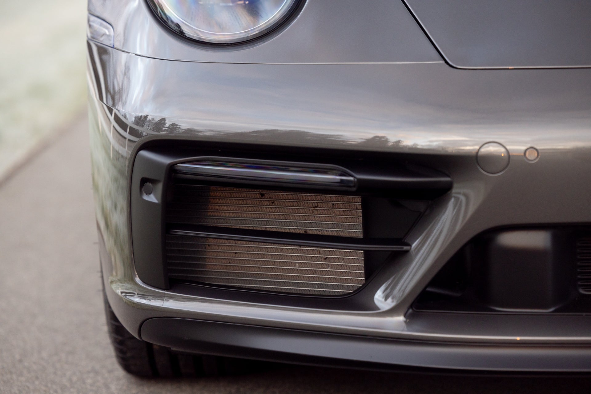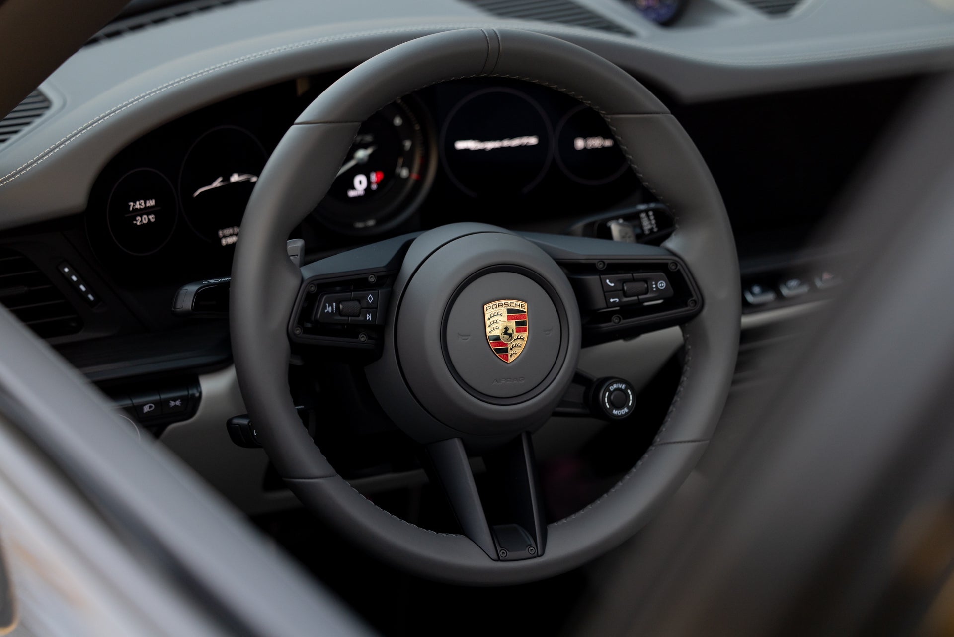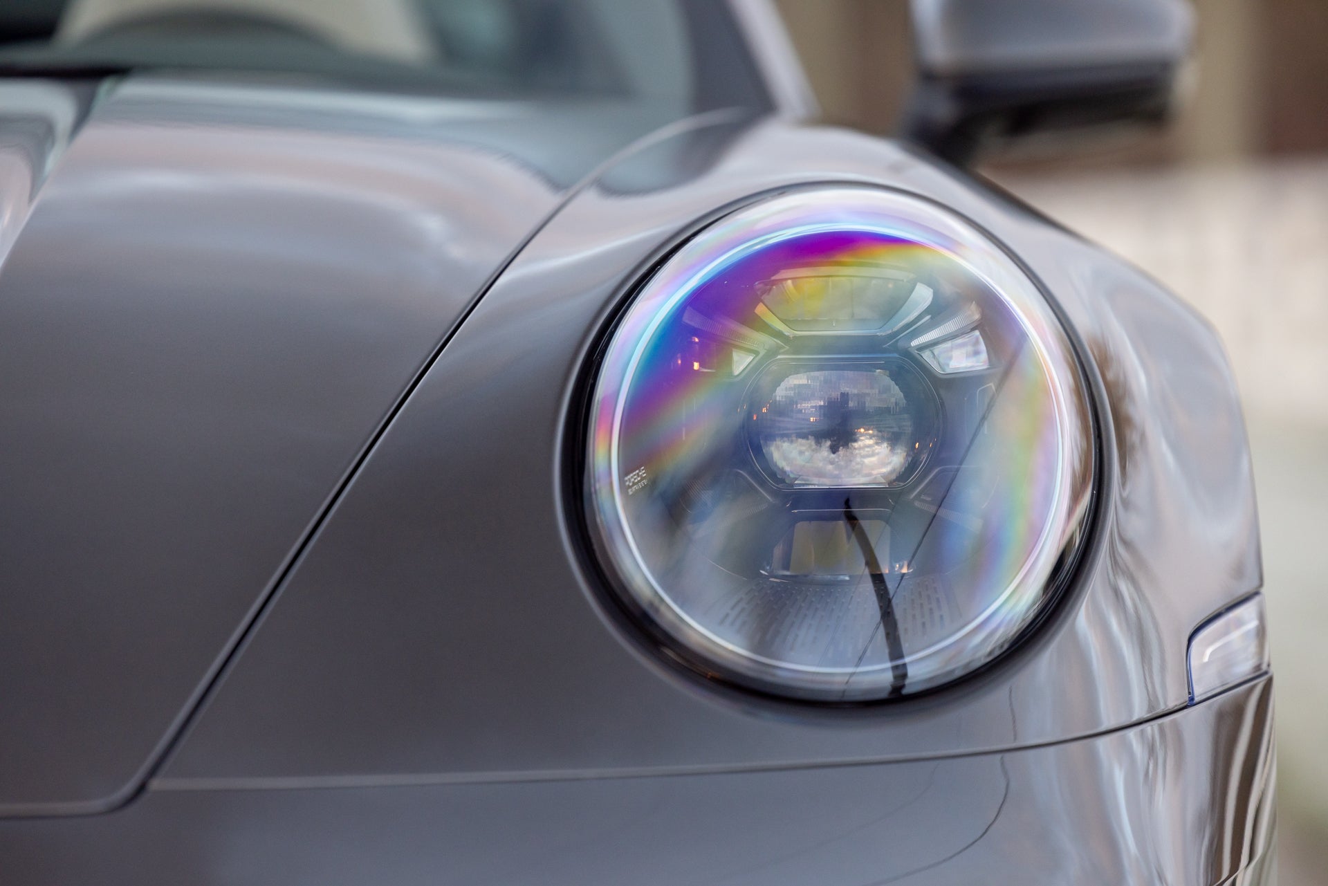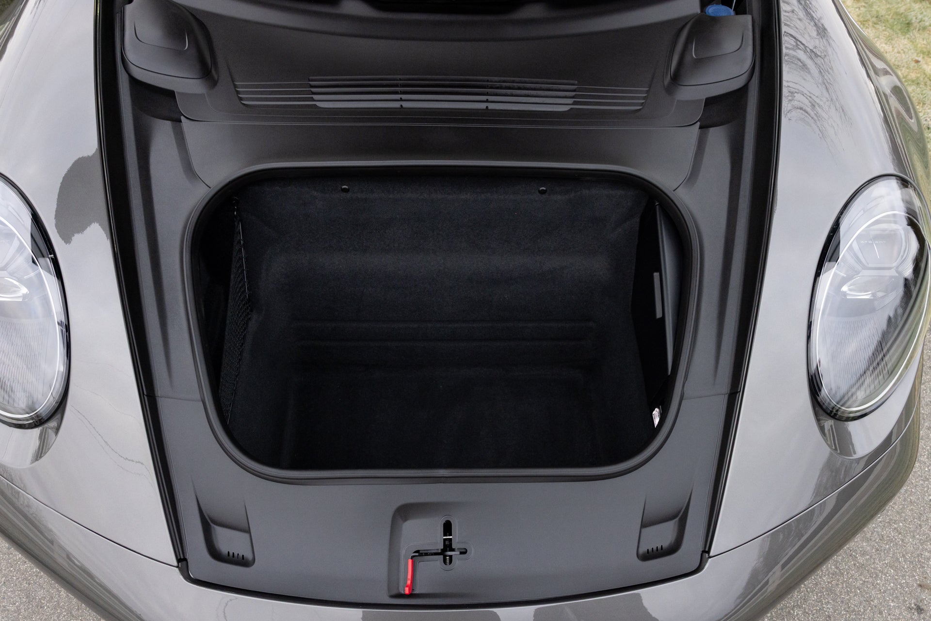 The exterior specification includes LED-Matrix Design Headlights in black with Porsche Dynamic Light System Plus, providing adaptive illumination that adjusts beam patterns based on traffic and road conditions. Exclusive Design Taillights distinguish the rear lighting signature from standard 911 variants. Under-door puddle light projectors illuminate the entry area when approaching the vehicle, and the black fabric Targa roof contrasts with the Agate Grey Metallic bodywork. Front axle lift addresses ground clearance for driveways and steep approaches, while rear-axle steering improves low-speed maneuverability and high-speed stability through the variable steering geometry.